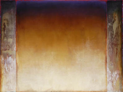 Tom Kirby describes his own work as “the merging of Expressionism and Minimalism.” He gives free rein to his Expressionistic impulse within the first several layers: the emotion and spontaneity of his hand’s gestures as he applies the underpainting, the unpredictable texture and sheen of paint that he might thicken with sand or marble dust. He invites the happy accident by allowing the surface to crack and split, by letting the paint drip and flow, and by leaving wet paintings out in the rain and sun.
